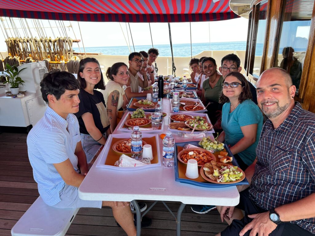 Siamo partiti da Roma con un giorno di anticipo perché il porto di partenza assegnato era quello di Milazzo, in Sicilia. Questo ha significato per i nostri ragazzi un importante investimento di impegno ed energie…una sveglia all’alba per quelli più lontani (Loris arrivava da Firenze!) e un lungo viaggio in treno per giungere al punto di inizio della nostra avventura. Poi, come da programma, ci siamo imbarcati sul Brigantino di Nave Italia per compiere una lunga traversata di quasi 260 miglia nautiche dalla Sicilia nord orientale fino al basso Lazio con tappa a Stromboli (ME) e Positano (SA) per giungere nella giornata di sabato 23 luglio 2022 nel porto di Gaeta (LT).