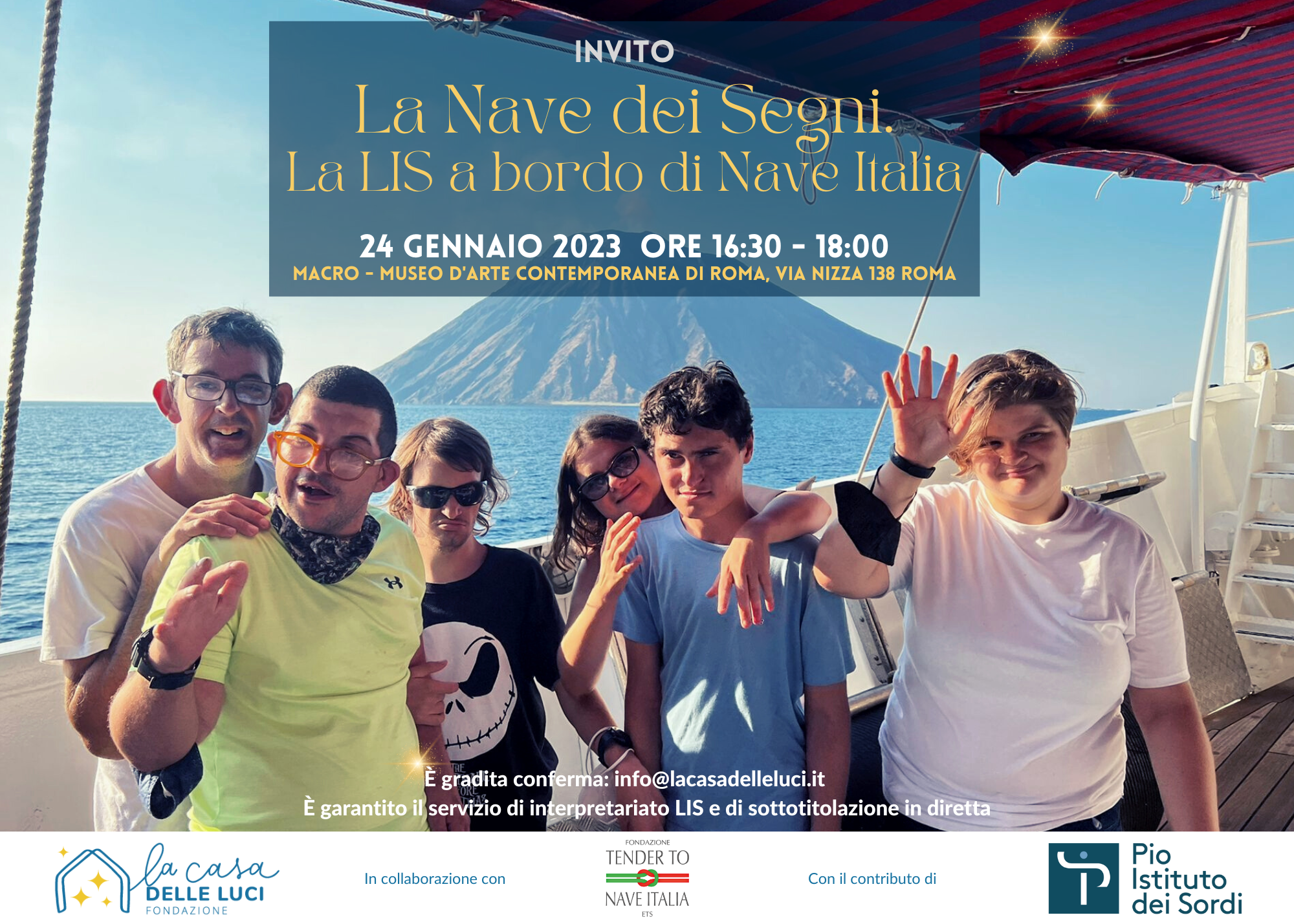 Martedì 24 Gennaio 2023 alle ore 16.30 presso MACRO Museo di Arte Contemporanea di Roma (Via Nizza 138 – Roma) si terrà l’evento – organizzato da La Casa delle Luci – “La Nave dei Segni. La LIS a bordo di Nave Italia”.
